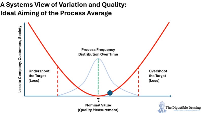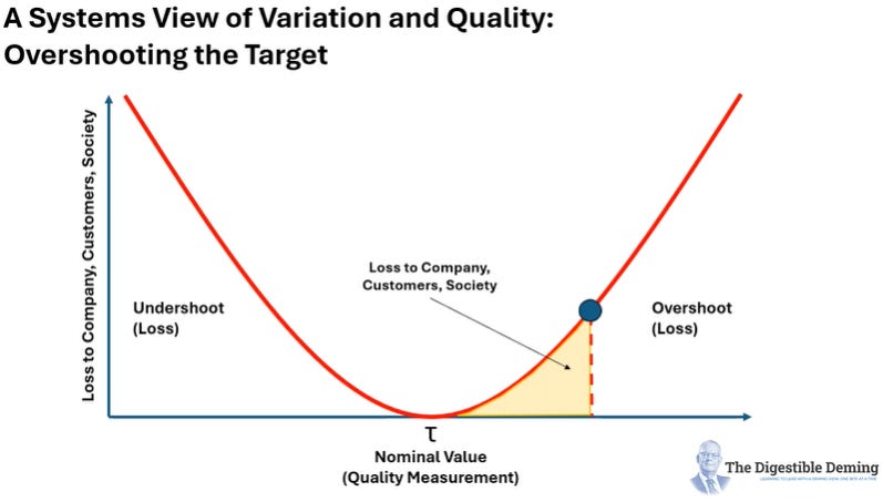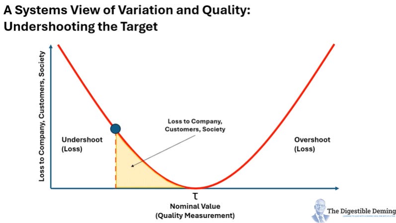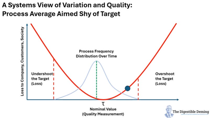 In the first slide we see the effect of under-shooting the target, producing a large area under the curve that defines the loss, both in terms of value, but also in intangibles to employees, the company, its customers, and society. Yes, society! Whatever we fail to make to a suitable level of quality means we let down customers and by extension society!