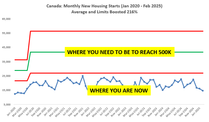 In another case, much political capital and ink has been spent here in Canada about our inability to build enough housing to meet demand, with the government making claims they would “invest” to help build 3M+ homes by 2030, or about an average of 500k per year at the time the promise was made. No methods were offered to achieve this goal, nor real data analyzed in a way to assess the reality of whether it could be achieved by the present system. So I created a visualization based on a process behaviour chart to make the reality plain: without some miraculous change in the system of new home construction (which extends beyond the job site), this won’t happen. It is well-beyond our current capabilities.