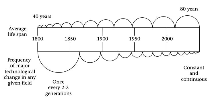 Why is learning so important for new leaders to understand and internalize as a core competency? As shown in the figure below, Scholtes identifies two interrelated reasons: our increasing lifespans and the commensurate increasing frequency of major technological leaps: