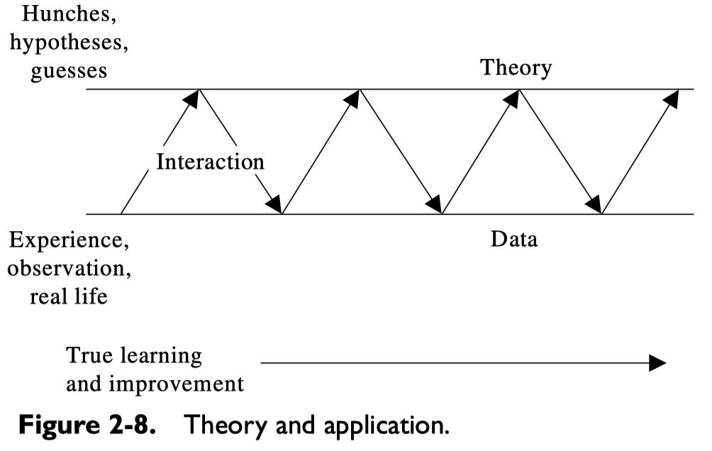 In Out of the Crisis and The New Economics, Dr. Deming keenly observes that without theory, experience teaches nothing—all we need is a hunch or guess on what we predict will happen to begin accumulating knowledge about what to do to improve. Knowledge is the product of the dynamic interplay between a theory and experiential feedbacks, which Scholtes illustrates below, borrowing from a similar illustration by Prof. George Box:
