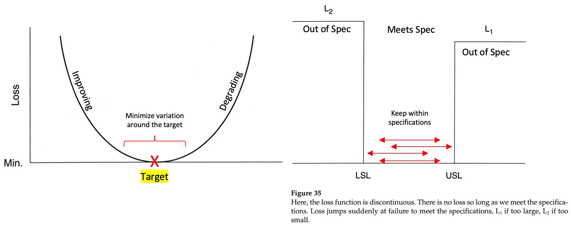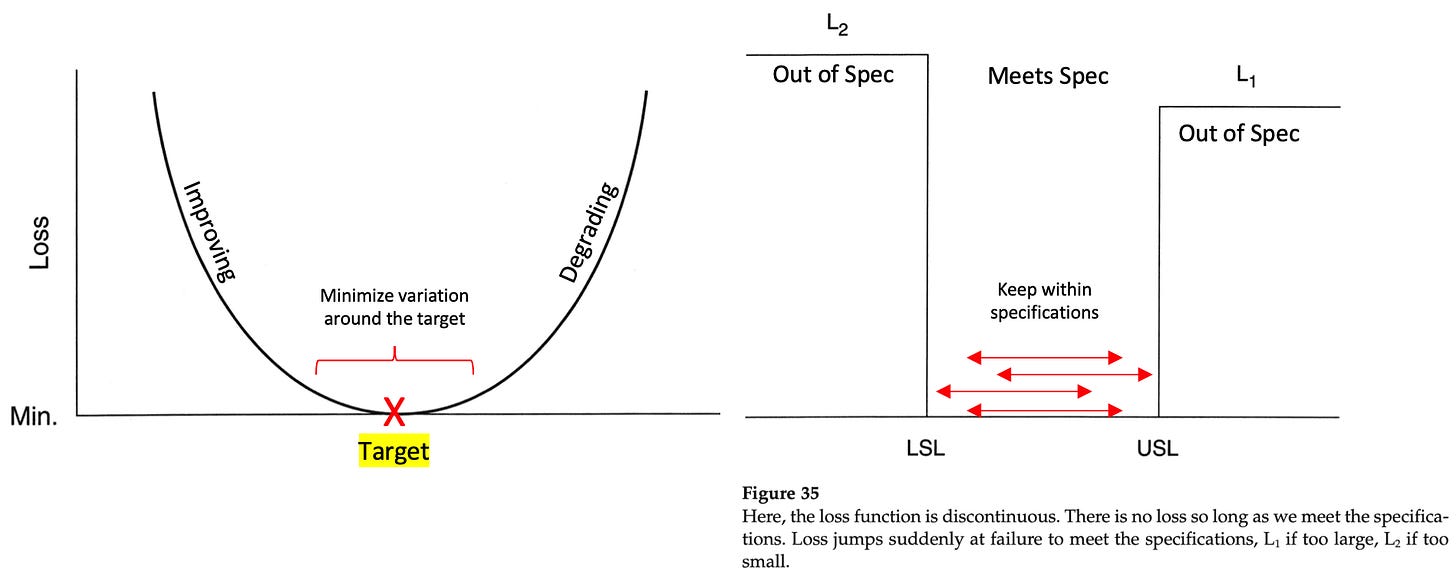 The magic that enabled the Japanese team to achieve such results can be attributed to the models devised some twenty years earlier by Dr. Genichi Taguchi with his eponymous loss function curves that visualize quality as a continuum around a nominal target as opposed to a binary in/out condition gate as pictured below. As Dr. Deming writes in The New Economics, the curve “help[s] us to change from a world of specifications (meet specifications) to continual reduction of variation around a target, through improvement of processes”. We'll explore Taguchi Loss functions in more detail in an upcoming post.