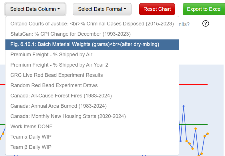 Load a data column and observe the signals you see in the data. Adapt the analysis by clicking data points to shift the limits and break the chart down into segments. Try flipping into Baseline Mode and calibrating the chart’s limits around a new mean. Toggle the Sigma Units bands on to see The Empirical Rule in action.