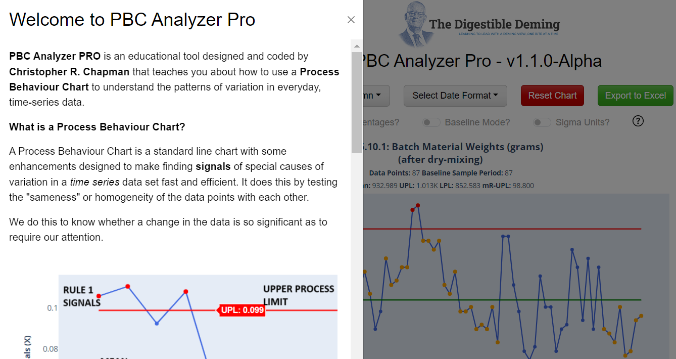 THE AIM for this post is to let you know I’ve implemented a free version of my PBC Analyzer PRO app that will allow you to try out all the features paid-tier subscribers have been enjoying except for the ability to analyze your own data. With this free version you can see how easy it is to spot signals in time-series data and adapt analyses for deeper insights.